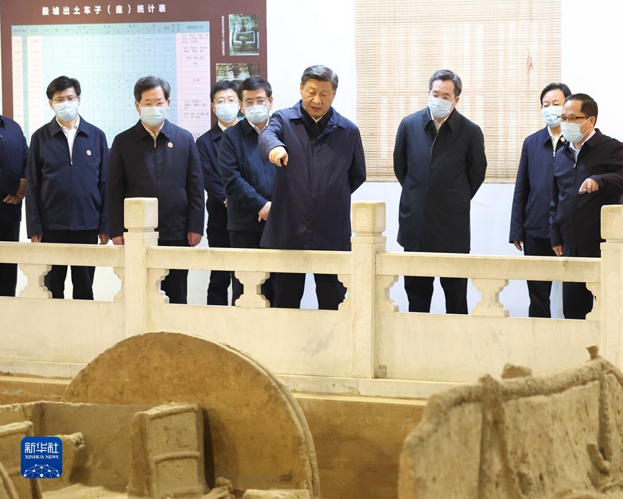 10月26日至28日,中共中央總書記、國家主席、中央軍委主席習近平在陜西省延安市、河南省安陽市考察。這是28日下午,習近平在安陽市殷墟遺址考察。 新華社記者 丁林 攝